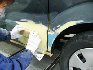 車のへこみなどを専用の器具やパテで補修します。塗装で隠れてしまう部分ですが、鈑金工程の仕上がりが出来上がりの品質を大きく左右します。